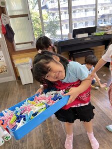 たくさんの洗濯ばさみをつなげたり、洋服に付けてドレスアップしたり楽しいよ!