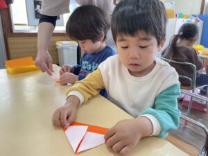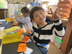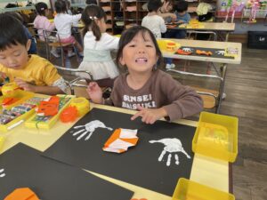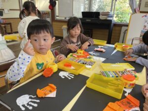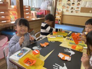 かぼちゃを折り紙でつくって手形おばけが遊びにきましたよ。