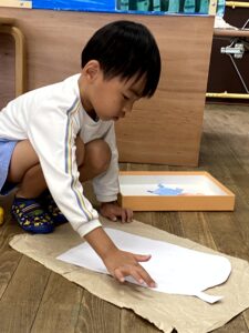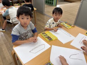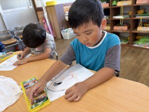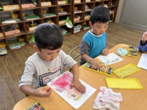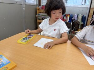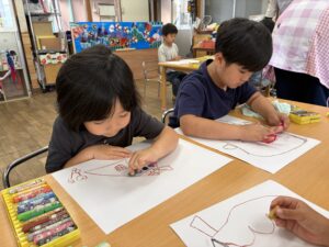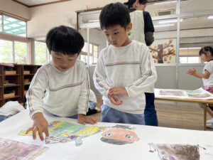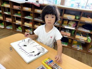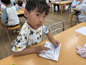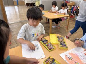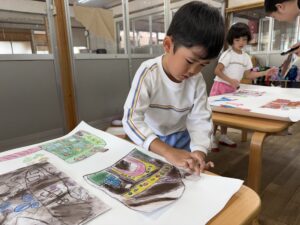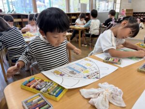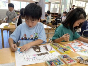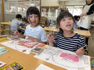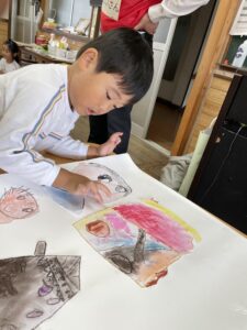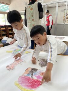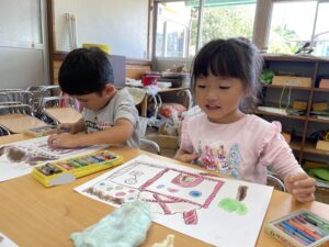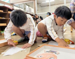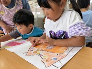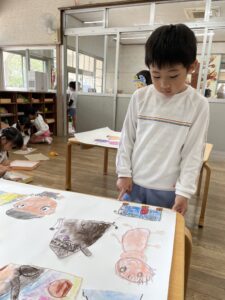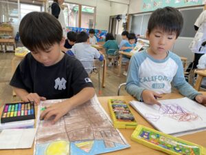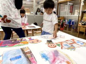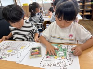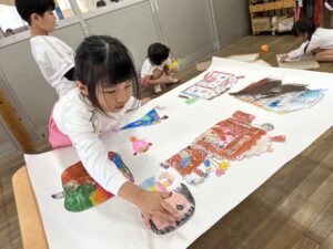 自分たちで描いた家を自分たちで大判用紙に貼っていきます。