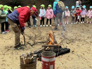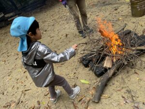 ぼくたちは木の棒を集めて火の中に入れたよ。