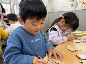 木のパーツをもらって中心の底部に自分たちで名前を書きました。