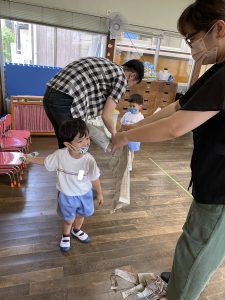 お母さんに新聞を持ってもらって、新聞の棒でえいっ!