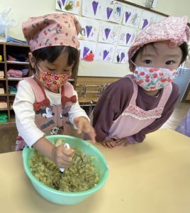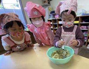 いもがつぶれたら、砂糖と牛乳を入れて混ぜます!