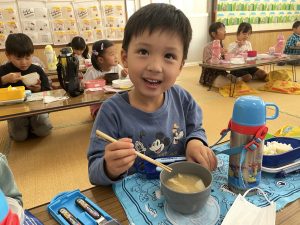 おとな組の人が作ってくれた油で揚げたお芋スティックを食べてます。