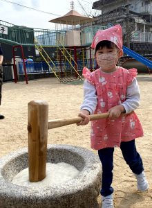 初めは大人が餅つきをしてくれたので皆は仕上げです。