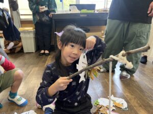 葉っぱやどんぐりを使って魚に飾りを付けます。